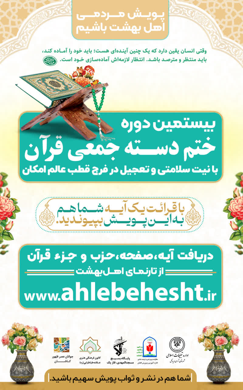 به گزارش اداره امور قرآنی اداره کل تبلیغات اسلامی استان اصفهان؛ همزمان با ایام باسعادت حضرت ولی عصر (عجل الله تعالی فرجه‌الشریف) و همزمان با فرارسیدن ماه پر برکت شعبان‌المعظم، بیستمین دوره پویش مردمی «اهل بهشت باشیم» با محوریت ختم دسته‌جمعی قرآن کریم و صلوات، از سوی مجموعه جوانان عصر ظهور کاشان و کانون فرهنگی علامه طباطبایی در حال اجراست.